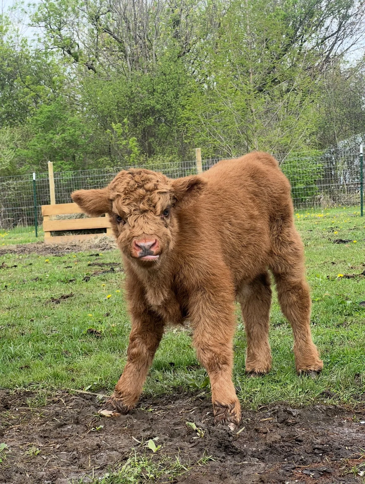 The first calf to be born at Mini Mitten Acres! Born on May 1st 2025, this sweet bull is 1 of 1! Ace’s mama is Poppy and they have been stuck together since the day he was born! Red brindle, non chondro. Available now, ready to go early Fall 2025.